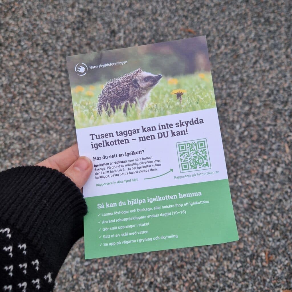 För att göra en verklig skillnad är det viktigt att sprida information till alla i grannskapet. På Bjäre delade man ut 750 informationskort till hushållen för att informera om igelkottarna och hur man kan hjälpa till, till exempel genom att ställa om sina robotgräsklippare och lämna skyddade områden i trädgården. Skapa en flyer eller använda sociala medier för att engagera fler och få alla att delta i insatsen!